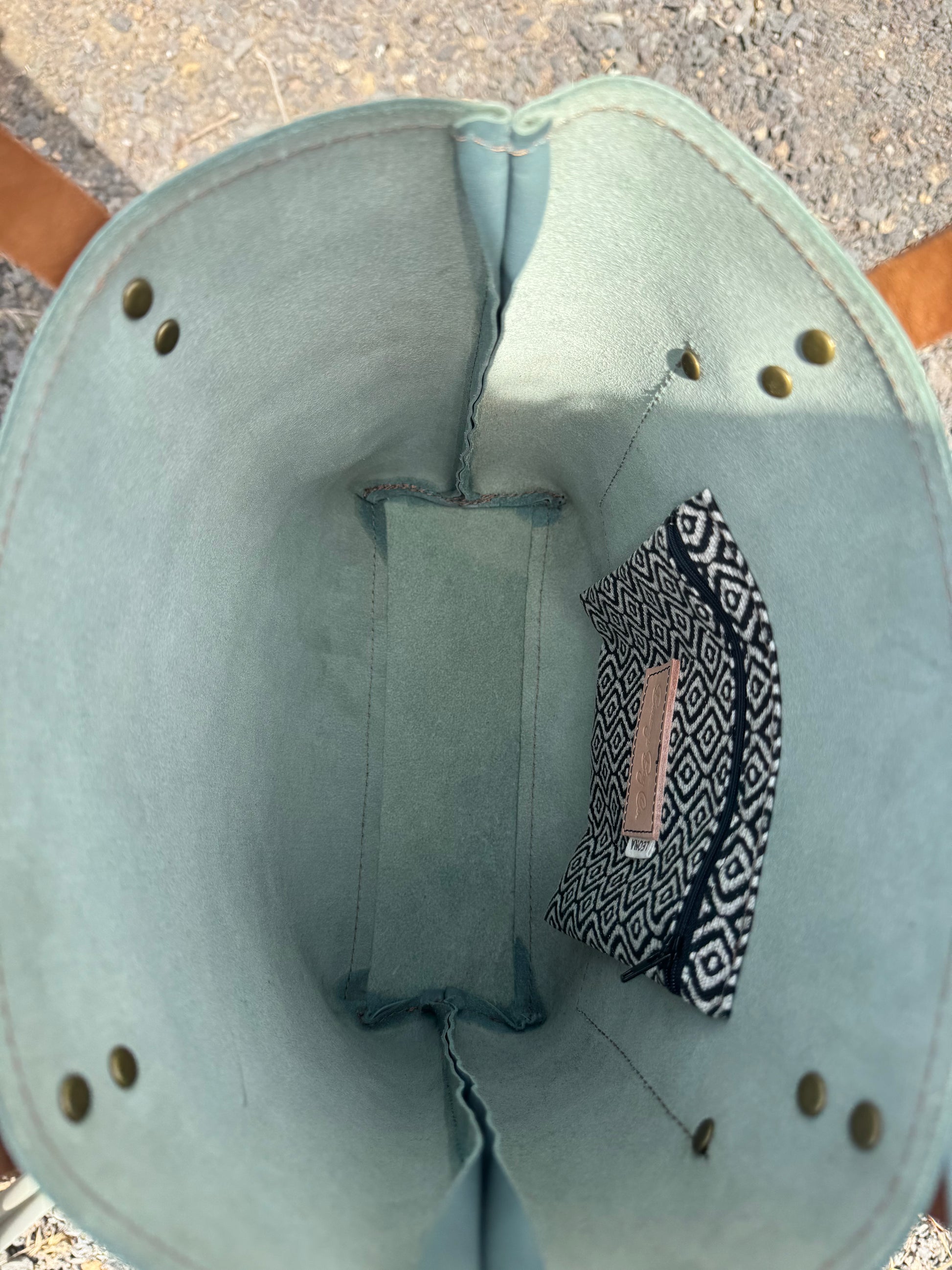 This Leona Leather Tote features a beautiful seafoam green body with brown leather straps. Perfect for a great summer purse! There is an exterior pocket, rivets and an interior pocket that zips. Our leather bags are unlined so on the inside you can see the natural suede of the hide. The Leona is light enough to carry as an everyday purse with lots of room to fill up as a tote.