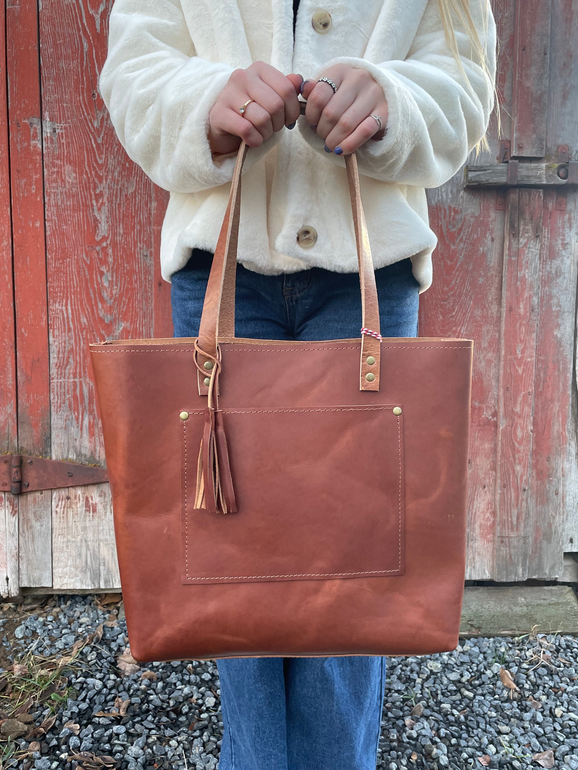 This Lila Leather Tote features a milk chocolate brown body with lighter brown leather straps, an exterior pocket, rivets and an interior pocket that zips. Our leather Lila totes are unlined so on the inside you can see the natural suede of the hide. The Lila is great to use as a market tote with lots of room but light enough to carry as an everyday purse.