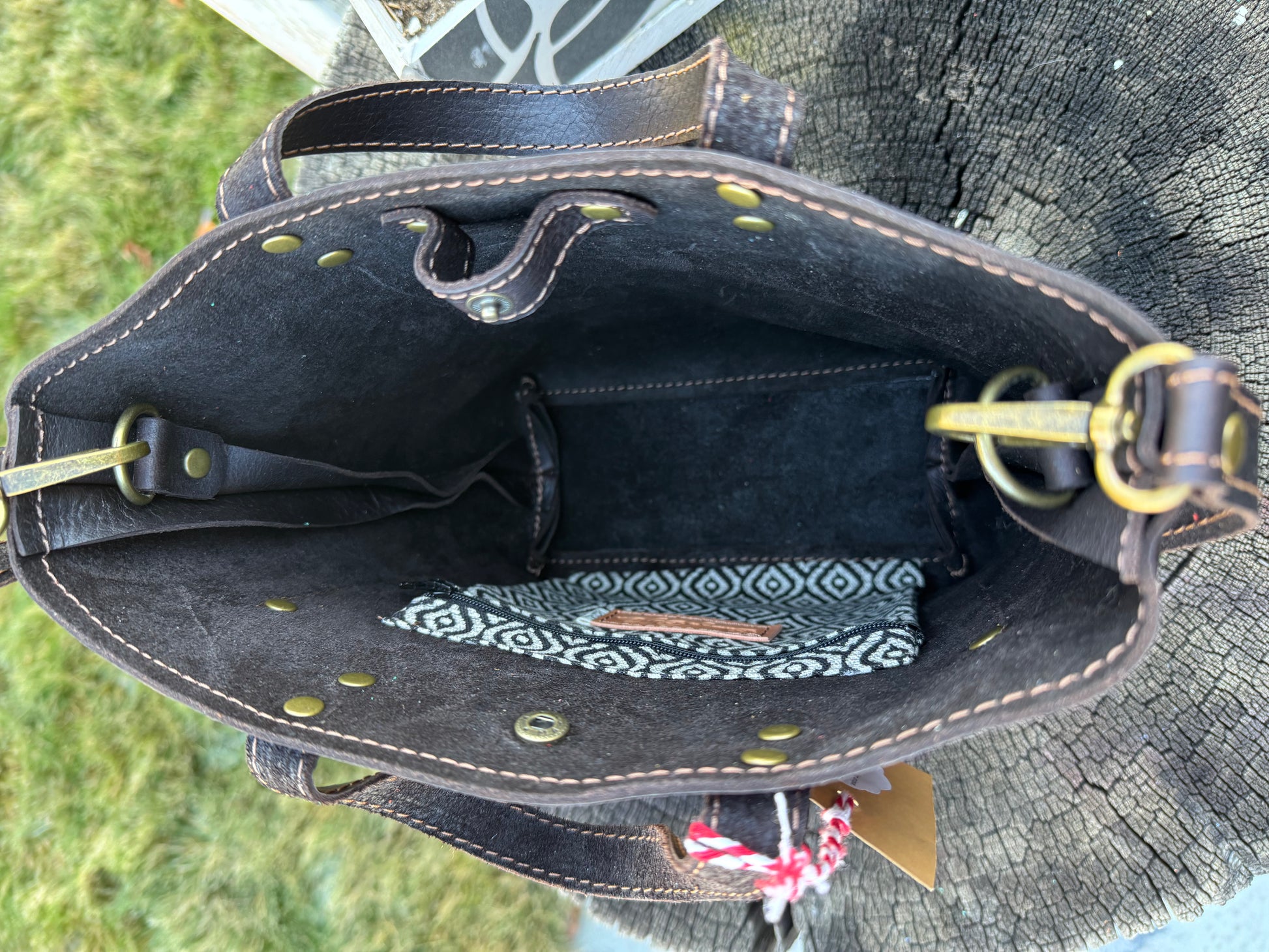This Trudy Leather Purse features a black gaucho body, handles and detachable crossbody strap. This purse can be carried by its small handles or over the shoulder as a crossbody. It has a snap closure, exterior pocket, rivets and an interior pocket that zips. Our leather Trudy's are unlined so on the inside you can see the natural suede of the hide. This is one of our smallest purses but surprisingly holds more than you think!